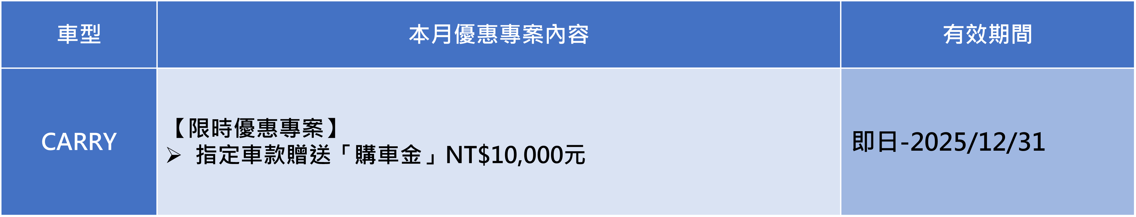 2. CARRY指定車款,可享萬元購車金為購車後抵用上限為$10,000元,購車金限當車當次購買抵用,實際交易價格由買賣雙方各自依交易條件議定之,詳情請洽各大經銷商。本活動不適用租賃、營業、政府機關及專案批/標購之車輛。