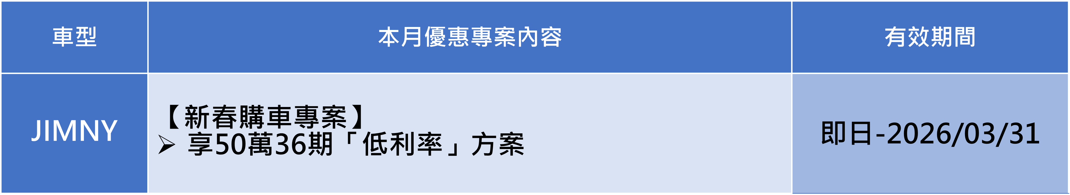 3. 【 2.50% 低利率方案】適用車款為JIMNY,活動期間為2026/03/01-2026/03/31,以上分期專案經銷商及和潤企業保有審核之權利,且不得與其他優惠專案併用。