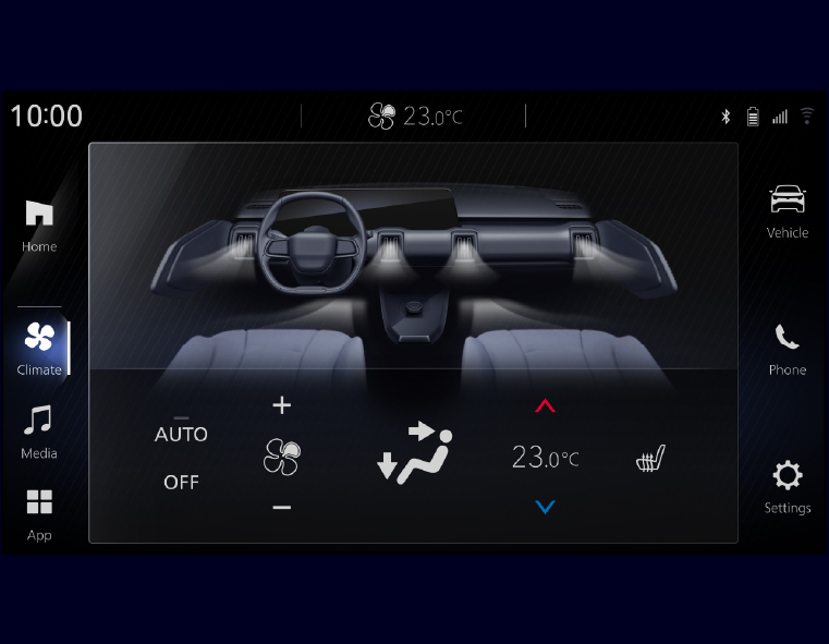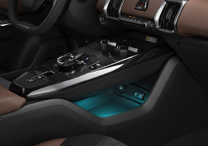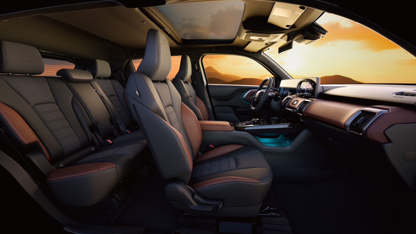 座艙延續「High-Tech & Adventure」主題,以直線構成的簡潔佈局、雙螢幕整合式顯示系統、懸浮式中控台,以及運用透明材質和環艙氣氛燈來營造輕盈感。數位座艙搭配雙色材質包覆,搭配四組導流式出風口與包覆感極佳的前座,編排布局更加成熟洗鍊,完美詮釋新世代電動 SUV的精緻感與科技感。