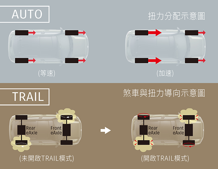 ALLGRIP-e承襲 SUZUKI 著名的 ALLGRIP 四輪驅動科技,加入更多電子智慧科技隨時偵測輔助,與 2WD 相比,雙馬達配置可輸出超過 1.5 倍的最大扭力;而前後 eAxle 獨立運作,可以因應地形隨機應變。AUTO 與 TRAIL 兩種模式都能強化動態表現與穩定性,讓你無所畏懼迎接各種挑戰。