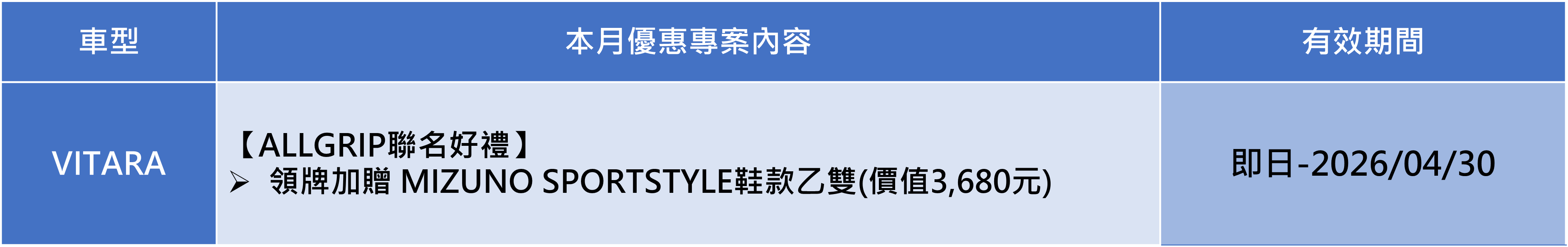 3. *「SUZUKI ALLGRIPxMIZUNO 跨界聯名專案」:本活動之適用對象為於2026/03/01~2026/03/31期間內購買S-CROSS 4WD、VITARA 4WD且完成領牌者,可獲得MXR乙雙(下稱贈品),原價新台幣3680元。數量及鞋子尺寸有限,送完為止。贈品以實物為準,恕不接受更換、退費或折抵現金。兌換憑證逾期、遺失或毀損,恕不補發。任何贈品使用之相關疑問,請逕洽台灣美津濃股份有限公司客服專線:02 2509-5100詢問, TAIWAN SUZUKI或原購車經銷商不負任何贈品擔保責任。 本活動不適用租賃、政府機關、專案批/標購者及營業車。兌換時間:2026年01月25日~2026年05月31日止。