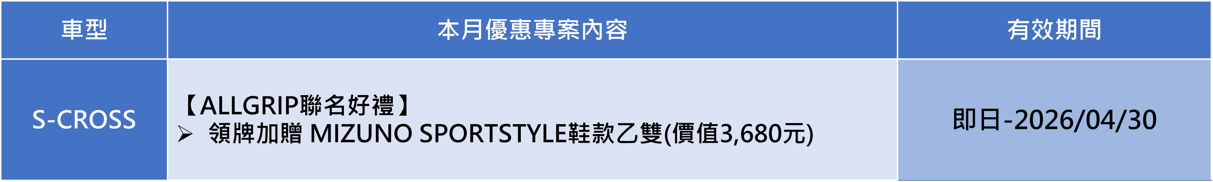 3. *「SUZUKI ALLGRIPxMIZUNO 跨界聯名專案」:本活動之適用對象為於2026/04/01~2026/04/30期間內購買S-CROSS 4WD、VITARA 4WD且完成領牌者,可獲得MXR乙雙(下稱贈品),原價新台幣3680元。數量及鞋子尺寸有限,送完為止。贈品以實物為準,恕不接受更換、退費或折抵現金。兌換憑證逾期、遺失或毀損,恕不補發。任何贈品使用之相關疑問,請逕洽台灣美津濃股份有限公司客服專線:02 2509-5100詢問, TAIWAN SUZUKI或原購車經銷商不負任何贈品擔保責任。 本活動不適用租賃、政府機關、專案批/標購者及營業車。兌換時間:2026年01月25日~2026年05月31日止。