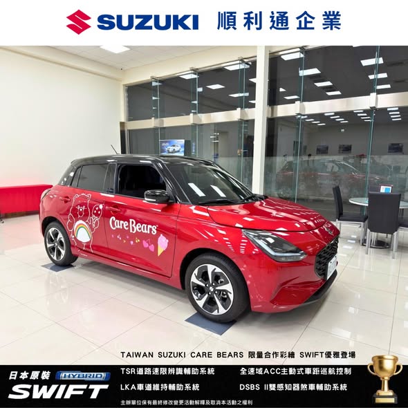 最新車訊 2026/03/31 Swift Care Bears彩繪特式車登場 | 順利通企業 鳳山所 分享本文 / 生活好緊繃,需要一點療癒嗎?天啊!風靡全球的 Care Bears 彩虹熊 居然真的降臨在 SUZUKI SWIFT 上啦!換上 Care Bears 夢幻限定彩繪後,簡直可愛度爆表,優雅指數直升天際! 現在就來 SUZUKI 順利通企業 鳳山所 一睹為快!巡迴展資訊活動日期:2026/3/31 ~ 2026/4/12店頭名稱:SUZUKI 順利通企業 鳳山所展出地點:高雄市鳳山區瑞隆東路 118 號賞車時間:8:30~21:00預約電話:(07) 766-6888