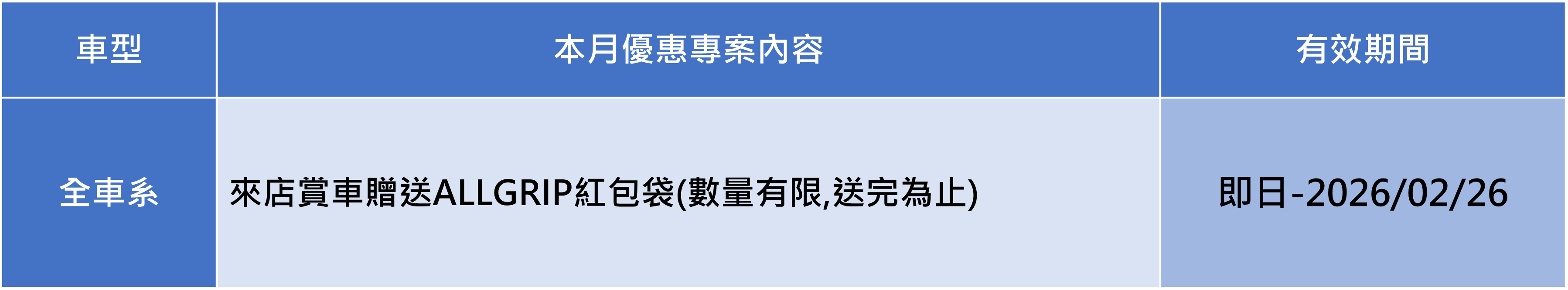 2. 2026年2月各車款領牌之促銷方案,期間為自即日起至2026年02月26日前完成領牌程序者有效。本活動不適用租賃、營業、政府機關及專案批/標購之車輛。