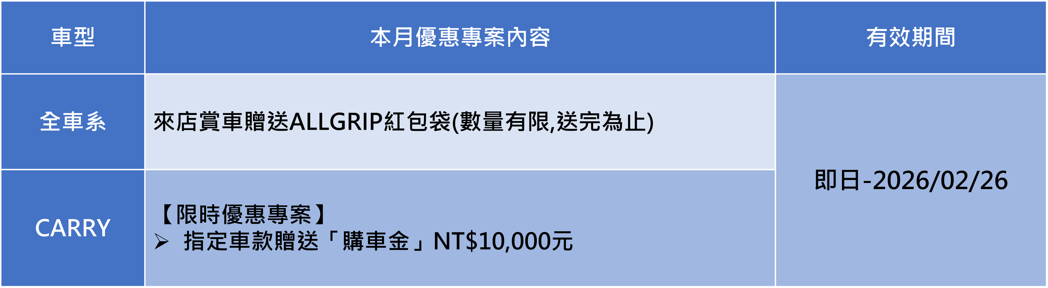 1. 2026年2月各車款領牌之促銷方案,期間為自即日起至2026年02月26日前完成領牌程序者有效。