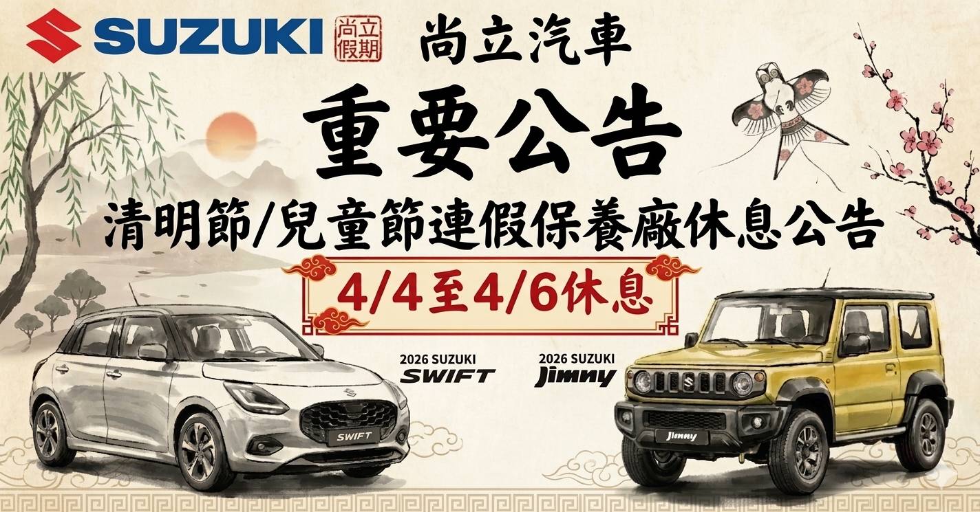 公告訊息 2026/03/30 清明連假|休息公告 分享本文 / 清明連假即將到來,保養廠將進行休息調整。提醒大家出遊前記得先檢查愛車狀況,讓連假行程平安又順心! 休息期間:4月4日 (六) 至 4月6日 (一) 恢復營業:4月7日 (二) 起正常服務連假期間賞車不中斷,尚立展示中心都有營業唷不管是靈活可愛的 SWIFT還是越野硬漢 Jimny2026 全新車色與性能,都等著與你一起開啟下一段旅程! 尚立汽車 祝大家假期愉快,行車平安!