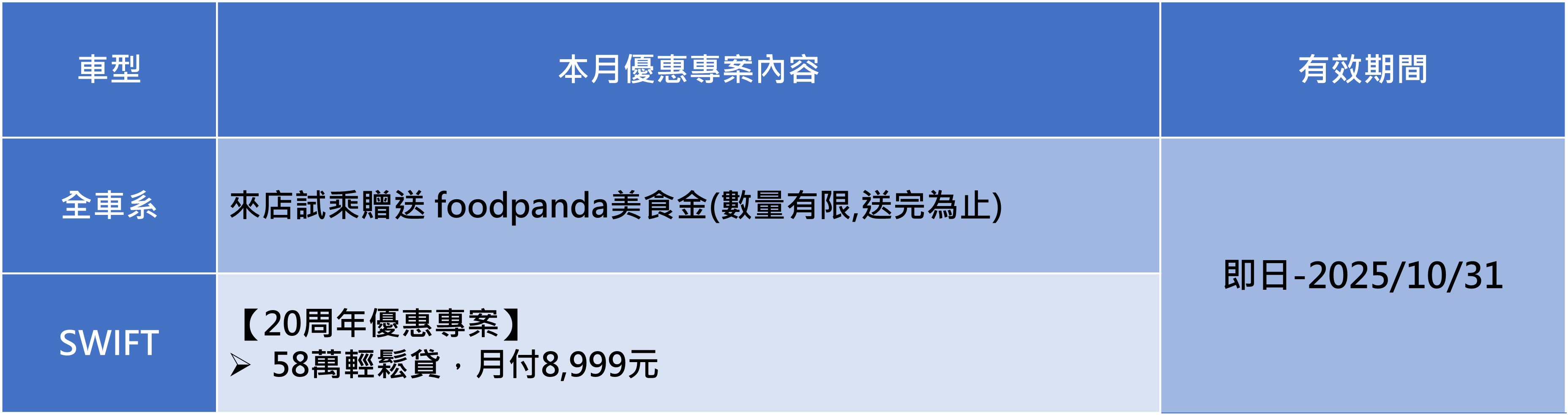 為了感謝台灣消費者20年來的支持與喜愛,TAIWAN SUZUKI特別推出「20周年優惠專案」,讓您以輕鬆月付8,999元的超值優惠,輕鬆入主暢銷神車SWIFT,無壓力享受高效節能的駕馭樂趣。此外,現在來店試乘SWIFT即可獲得foodpanada美食金,為您的旅程增添獨特品味,感受專屬於SWIFT的非凡魅力!