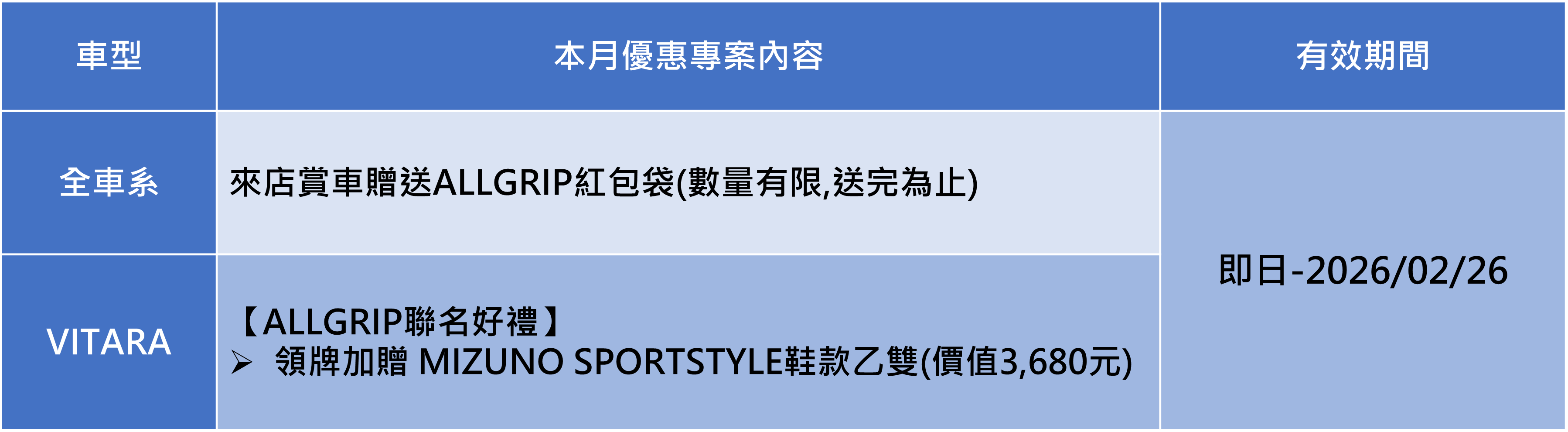 3. *「SUZUKI ALLGRIPxMIZUNO 跨界聯名專案」:本活動之適用對象為於2026/02/01~2026/02/26期間內購買S-CROSS 4WD、VITARA 4WD且完成領牌者,可獲得MXR乙雙(下稱贈品),原價新台幣3680元。數量及鞋子尺寸有限,送完為止。贈品以實物為準,恕不接受更換、退費或折抵現金。兌換憑證逾期、遺失或毀損,恕不補發。任何贈品使用之相關疑問,請逕洽台灣美津濃股份有限公司客服專線:02 2509-5100詢問, TAIWAN SUZUKI或原購車經銷商不負任何贈品擔保責任。 本活動不適用租賃、政府機關、專案批/標購者及營業車。兌換時間:2026年01月25日~2026年03月25日止。